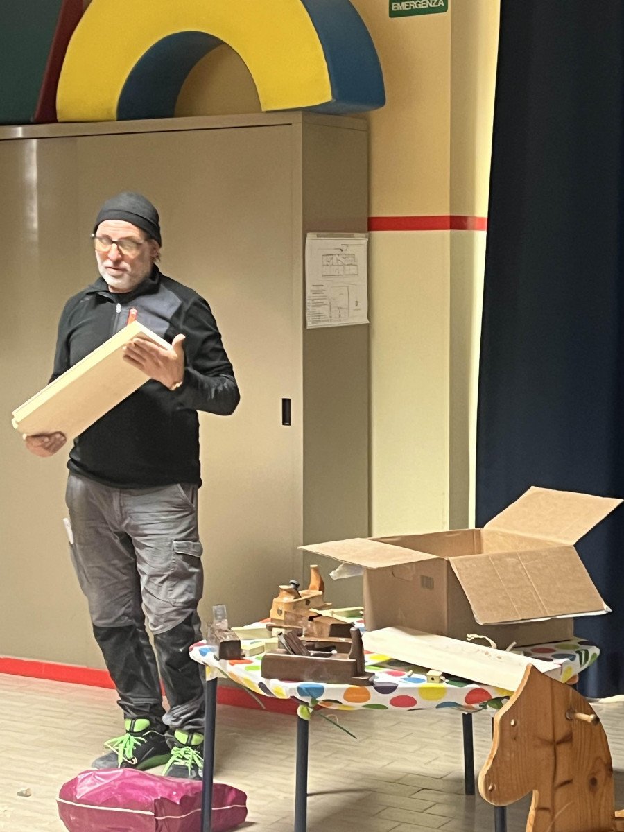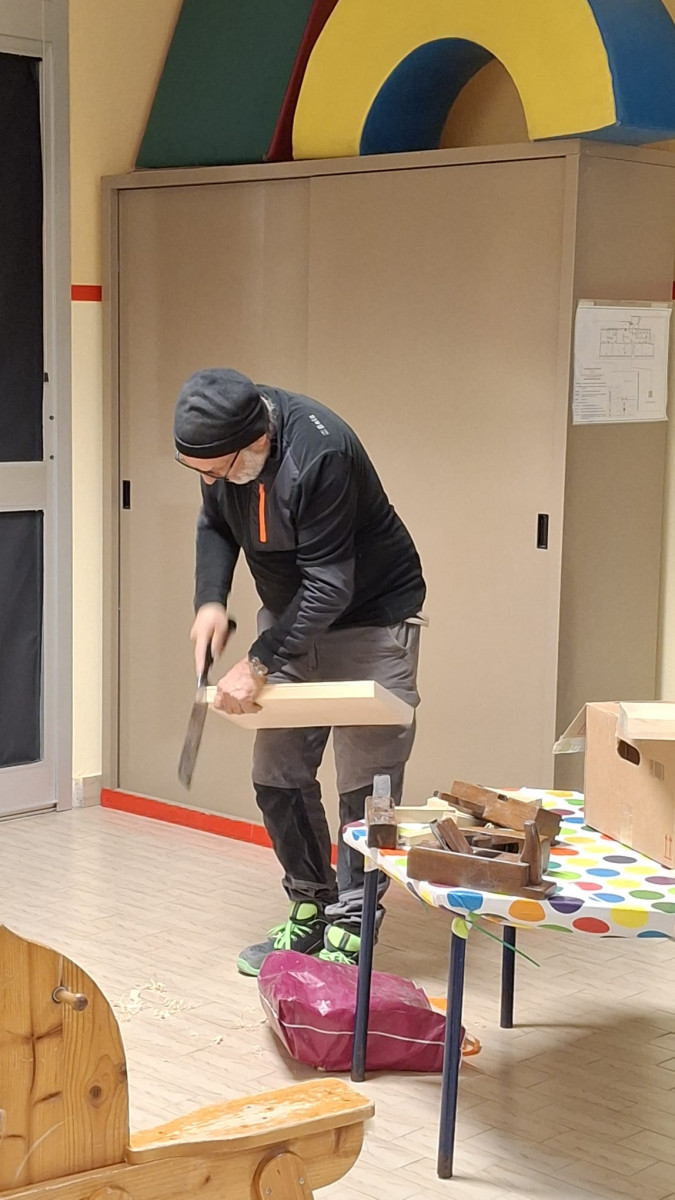 Oggi abbiamo incontrato un falegname, il signor Salvatore, che ci ha mostrato come si taglia il legno, come si pialla e come si fanno gli incastri.